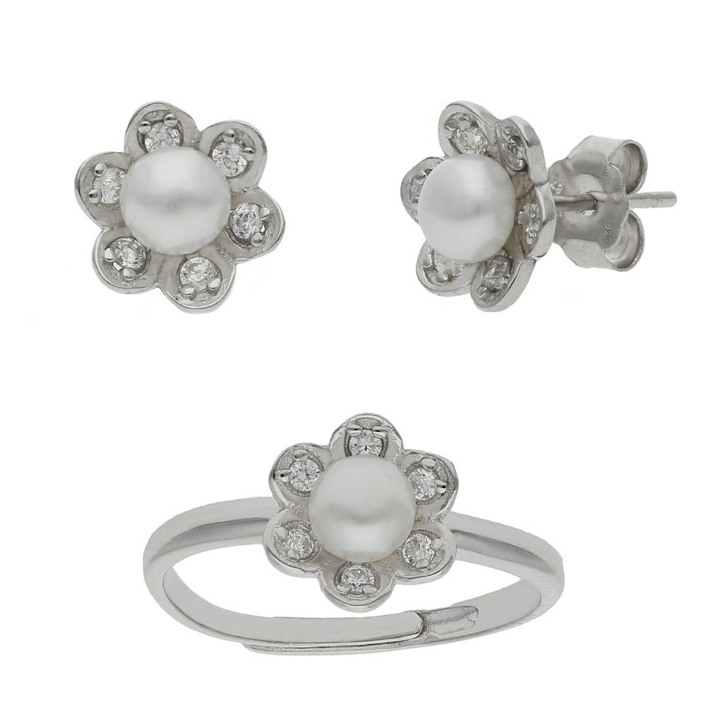Pendientes de flor en Plata de Ley de 925mm con perlas chinas + circonitas. Cierre de presión. Medidas del pendiente: 8mm. Sortija de flor en Plata de Ley de 925mm con perla china + circonitas. Ancho del motivo central: 8mm. Medida de anillo ajustable. Marca Lucarelli Joyas
