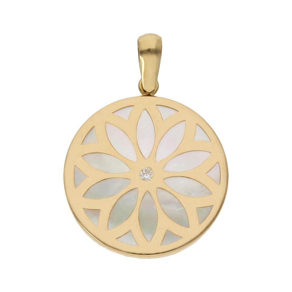 Colgante en Oro de 18 Kl. con nácar. Terminación en brillo. Diámetro del colgante: 16mm. Marca Lucarelli Joyas.